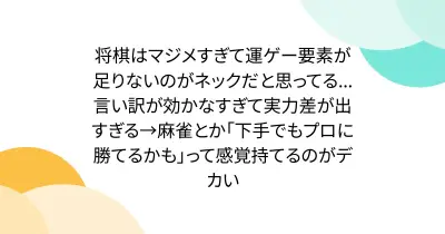将棋はマジメすぎて運ゲー要素が足りないのがネックだと思ってる...言い訳が効かなすぎて実力差が出すぎる→麻雀とか「下手でもプロに勝てるかも」って感覚持てるのがデカい