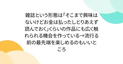 雑誌という形態は「そこまで興味はないけどお金は払ったしとりあえず読んでおく」くらいの作品にも広く触れられる機会を作っている→流行る前の最先端を楽しめるのもいいところ