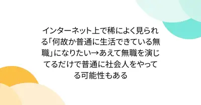 インターネット上で稀によく見られる「何故か普通に生活できている無職」になりたい→あえて無職を演じてるだけで普通に社会人をやってる可能性もある
