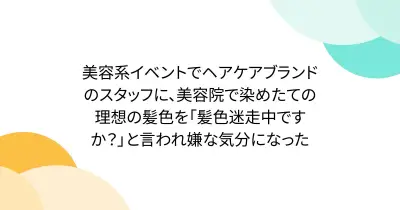 美容系イベントでヘアケアブランドのスタッフに、美容院で染めたての理想の髪色を「髪色迷走中ですか?」と言われ嫌な気分になった
