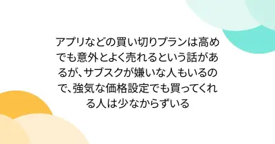 アプリなどの買い切りプランは高めでも意外とよく売れるという話があるが、サブスクが嫌いな人もいるので、強気な価格設定でも買ってくれる人は少なからずいる