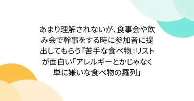 あまり理解されないが、食事会や飲み会で幹事をする時に参加者に提出してもらう『苦手な食べ物』リストが面白い「アレルギーとかじゃなく単に嫌いな食べ物の羅列」