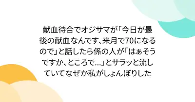 献血待合でオジサマが「今日が最後の献血なんです、来月で70になるので」と話したら係の人が「はぁそうですか、ところで...」とサラッと流していてなぜか私がしょんぼりした