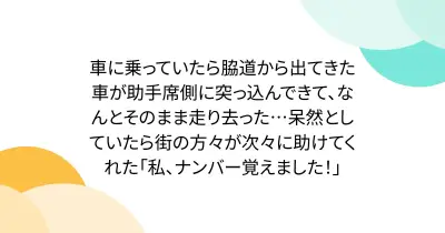 車に乗っていたら脇道から出てきた車が助手席側に突っ込んできて、なんとそのまま走り去った…呆然としていたら街の方々が次々に助けてくれた「私、ナンバー覚えました!」