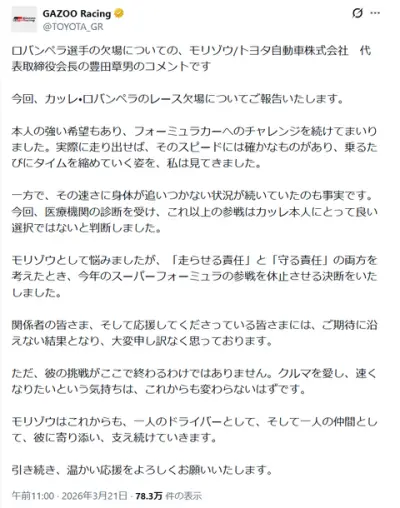 【衝撃】カッレ・ロバンペラ、2026年のスーパーフォーミュラを欠場へ。トヨタが公式発表