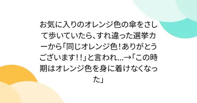 お気に入りのオレンジ色の傘をさして歩いていたら、すれ違った選挙カーから「同じオレンジ色!ありがとうございます!!」と言われ...→「この時期はオレンジ色を身に着けなくなった」