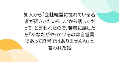 知人から「会社経営に憧れている若者が話ききたいらしいから話してやって」と言われたので、若者に話したら「あなたがやっているのは自営業であって経営ではありませんね」と言われた話