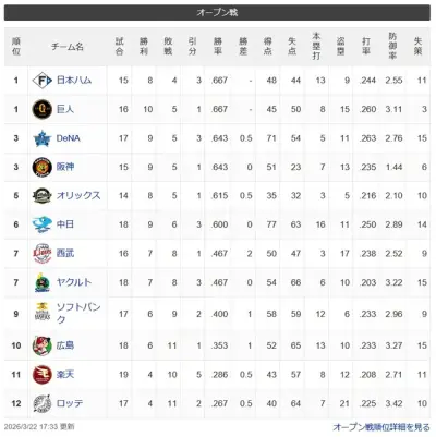 オープン戦順位表最終wwwwwwwwwwwwww