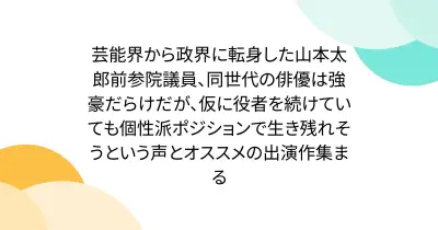 芸能界から政界に転身した山本太郎前参院議員、同世代の俳優は強豪だらけだが、仮に役者を続けていても個性派ポジションで生き残れそうという声とオススメの出演作集まる
