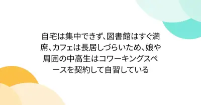 自宅は集中できず、図書館はすぐ満席、カフェは長居しづらいため、娘や周囲の中高生はコワーキングスペースを契約して自習している