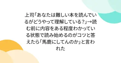 上司「あなたは難しい本を読んでいるがどうやって理解している?」→読む前に内容をある程度わかっている状態で読み始めるのがコツと答えたら「馬鹿にしてんのか」と言われた