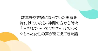 数年来空き家になっていた実家を片付けていたら、神棚の方から時々「…きれて……てくださ…」というくぐもった女性の声が聞こえてきた話