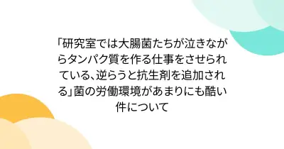 「研究室では大腸菌たちが泣きながらタンパク質を作る仕事をさせられている、逆らうと抗生剤を追加される」菌の労働環境があまりにも酷い件について