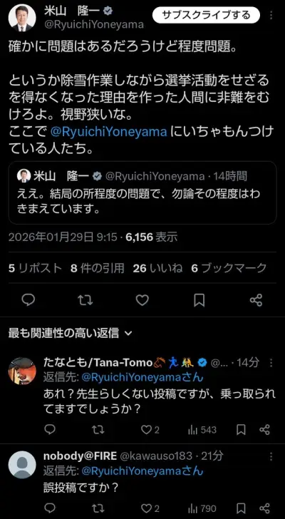 米山隆一「雪を道路にみだりに捨てると違法だが、私は加減をわかってるので問題ない」