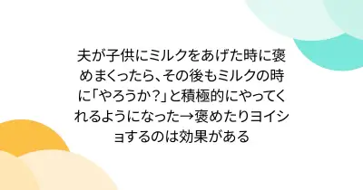 夫が子供にミルクをあげた時に褒めまくったら、その後もミルクの時に「やろうか?」と積極的にやってくれるようになった→褒めたりヨイショするのは効果がある