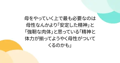 母をやっていく上で最も必要なのは母性なんかより「安定した精神」と「強靭な肉体」と思っている「精神と体力が揃ってようやく母性がついてくるのかも」