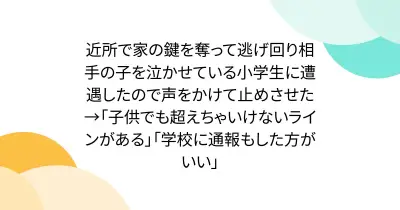 近所で家の鍵を奪って逃げ回り相手の子を泣かせている小学生に遭遇したので声をかけて止めさせた→「子供でも超えちゃいけないラインがある」「学校に通報もした方がいい」