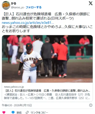 【巨人】石川達也が危険球退場 広島・久保修の頭部に直撃…倒れ込み担架で運ばれる