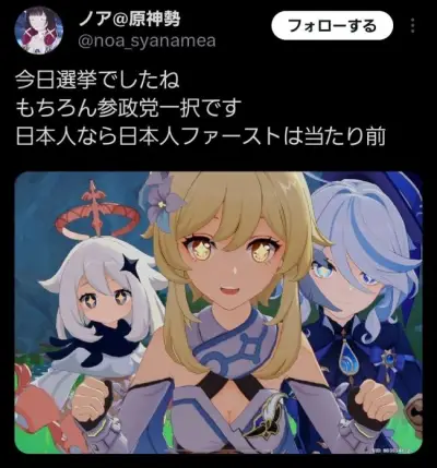 【画像】原神ファン、高市さんと参政党を応援する愛国者だった