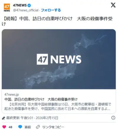 中国、訪日の自粛呼びかけ 大阪の殺傷事件受け