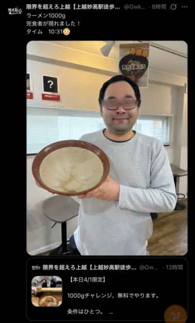 【画像】ラーメン1kgを10分31秒で完食した男wwwwwwwwwwwwwwwwww
