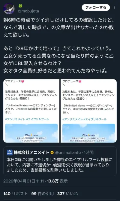 アニメイト、エイプリルフール投稿で謝罪 内容に不適切・配慮に欠く表現「ご不快な思いを」
