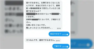 仕事に行きたくなくて1人だと気が重いということで「通勤に同行してほしい」と依頼された話… 依頼文には「行きたくない」が3回出てきて行きたくなさがかなり伝わってきた