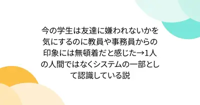 今の学生は友達に嫌われないかを気にするのに教員や事務員からの印象には無頓着だと感じた→1人の人間ではなくシステムの一部として認識している説