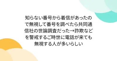 知らない番号から着信があったので無視して番号を調べたら共同通信社の世論調査だった→詐欺などを警戒するご時世に電話が来ても無視する人が多いらしい