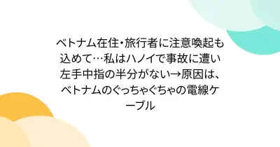 ベトナム在住・旅行者に注意喚起も込めて…私はハノイで事故に遭い左手中指の半分がない→原因は、ベトナムのぐっちゃぐちゃの電線ケーブル