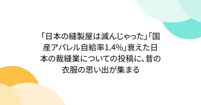 「日本の縫製屋は滅んじゃった」「国産アパレル自給率1.4%」衰えた日本の裁縫業についての投稿に、昔の衣服の思い出が集まる