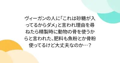 ヴィーガンの人に「これは砂糖が入ってるからダメ」と言われ理由を尋ねたら精製時に動物の骨を使うからと言われた、肥料も魚粉とか骨粉使ってるけど大丈夫なのか…?