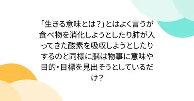 「生きる意味とは?」とはよく言うが食べ物を消化しようとしたり肺が入ってきた酸素を吸収しようとしたりするのと同様に脳は物事に意味や目的・目標を見出そうとしているだけ?