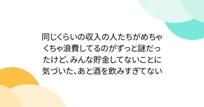 同じくらいの収入の人たちがめちゃくちゃ浪費してるのがずっと謎だったけど、みんな貯金してないことに気づいた、あと酒を飲みすぎてない