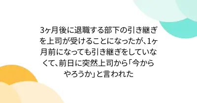 3ヶ月後に退職する部下の引き継ぎを上司が受けることになったが、1ヶ月前になっても引き継ぎをしていなくて、前日に突然上司から「今からやろうか」と言われた