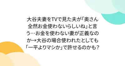 大谷夫妻をTVで見た夫が「奥さん全然お金使わないらしいね」と言う…お金を使わない妻が正義なのか→大谷の場合使われたとしても「一平よりマシか」で許せるのかも?