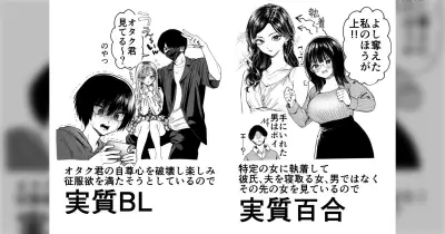 「オタク君の自尊心を破壊し征服欲を満たすNTRは『実質BL』」で「特定の女に執着してNTRは男の先の女を見ているので『実質百合』」、それぞれの続きマンガも爆誕