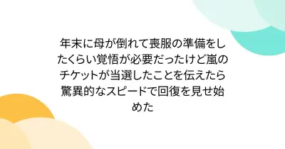 年末に母が倒れて喪服の準備をしたくらい覚悟が必要だったけど嵐のチケットが当選したことを伝えたら驚異的なスピードで回復を見せ始めた