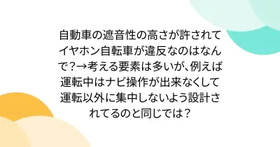 自動車の遮音性の高さが許されてイヤホン自転車が違反なのはなんで?→例えば運転中はナビ操作が出来なくして運転以外に集中しないよう設計されてるのと同じでは?