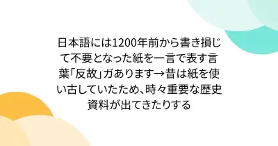 日本語には1200年前から書き損じて不要となった紙を一言で表す言葉「反故」ガあります→昔は紙を使い古していたため、時々重要な歴史資料が出てきたりする