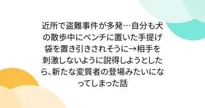 近所で盗難事件が多発…自分も犬の散歩中にベンチに置いた手提げ袋を置き引きされそうに→相手を刺激しないように説得しようとしたら、新たな変質者の登場みたいになってしまった話