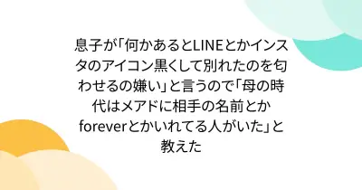 息子が「何かあるとLINEとかインスタのアイコン黒くして別れたのを匂わせるの嫌い」と言うので「母の時代はメアドに相手の名前とかforeverとかいれてる人がいた」と教えた