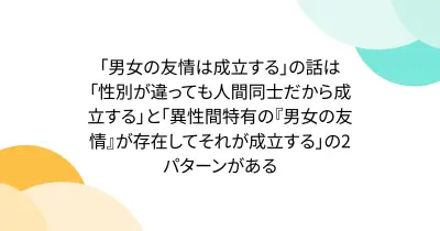 「男女の友情は成立する」の話は「性別が違っても人間同士だから成立する」と「異性間特有の『男女の友情』が存在してそれが成立する」の2パターンがある