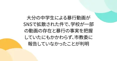 大分の中学生による暴行動画がSNSで拡散された件で、学校が一部の動画の存在と暴行の事実を把握していたにもかかわらず、市教委に報告していなかったことが判明