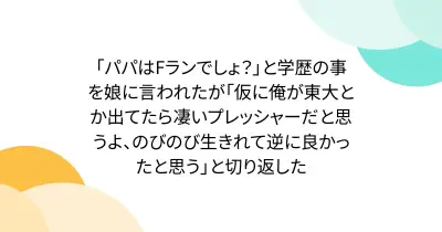 「パパはFランでしょ?」と学歴の事を娘に言われたが「仮に俺が東大とか出てたら凄いプレッシャーだと思うよ、のびのび生きれて逆に良かったと思う」と切り返した
