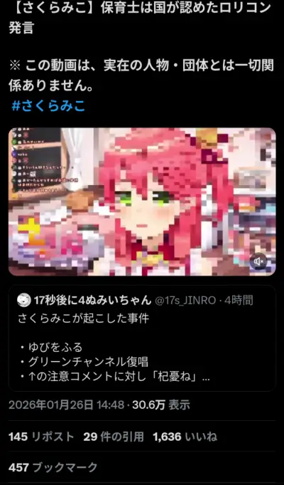 【悲報】さくらみこさん、今度は「保育士は国が認めたロリコン」発言で炎上してしまう。しかも半分捏造の模様