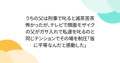 うちの父は刑事で叱ると滅茶苦茶怖かったが、テレビで顔面モザイクの父がガサ入れで私達を叱るのと同じテンションでその場を制圧「皆に平等なんだと感動した」