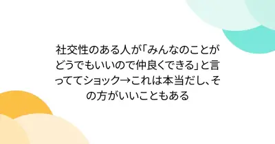 社交性のある人が「みんなのことがどうでもいいので仲良くできる」と言っててショック→これは本当だし、その方がいいこともある