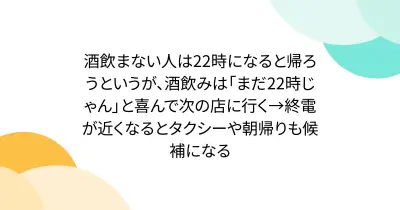酒飲まない人は22時になると帰ろうというが、酒飲みは「まだ22時じゃん」と喜んで次の店に行く→終電が近くなるとタクシーや朝帰りも候補になる