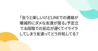 「会うと楽しいけどLINEでの連絡が壊滅的にダメな友達が居る」予定立てる段階での反応が遅くてイライラしてしまう友達ってどう対処してる?